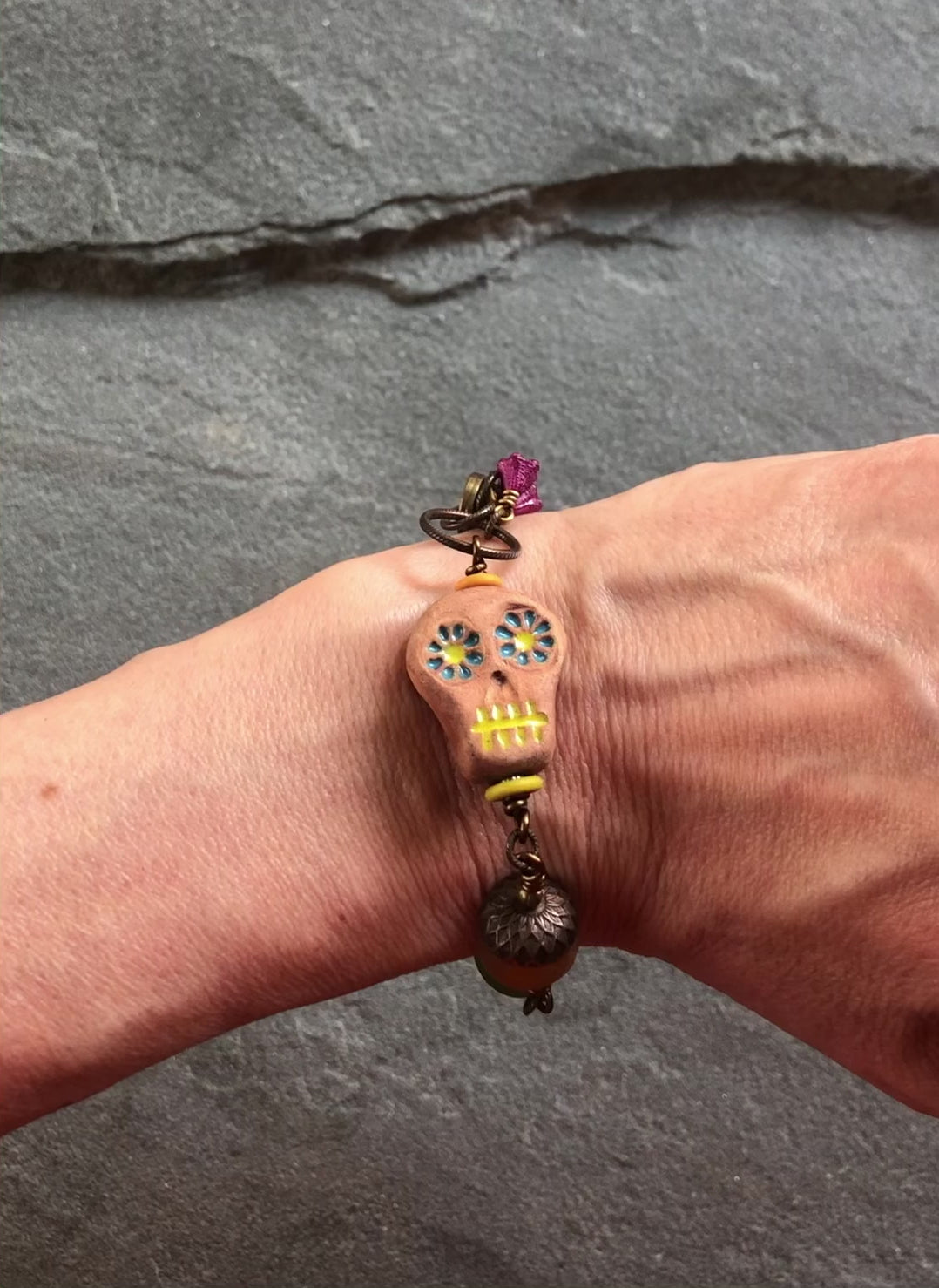 Make your wrist happy! Rainbow Sugar Skull Bracelet is a party for your wrist. Handcrafted with love using only the finest components, including: Artisan ceramic sugar skull focal bead, recycled African glass rounds, Czech glass flowers in fuchsia and marigold, antique brass finish acorn bead caps, textured antique brass finish jump rings, antique brass finish corrugated melons, antique brass headpins, antique brass finish wire, and an antique brass finish lobster clasp.